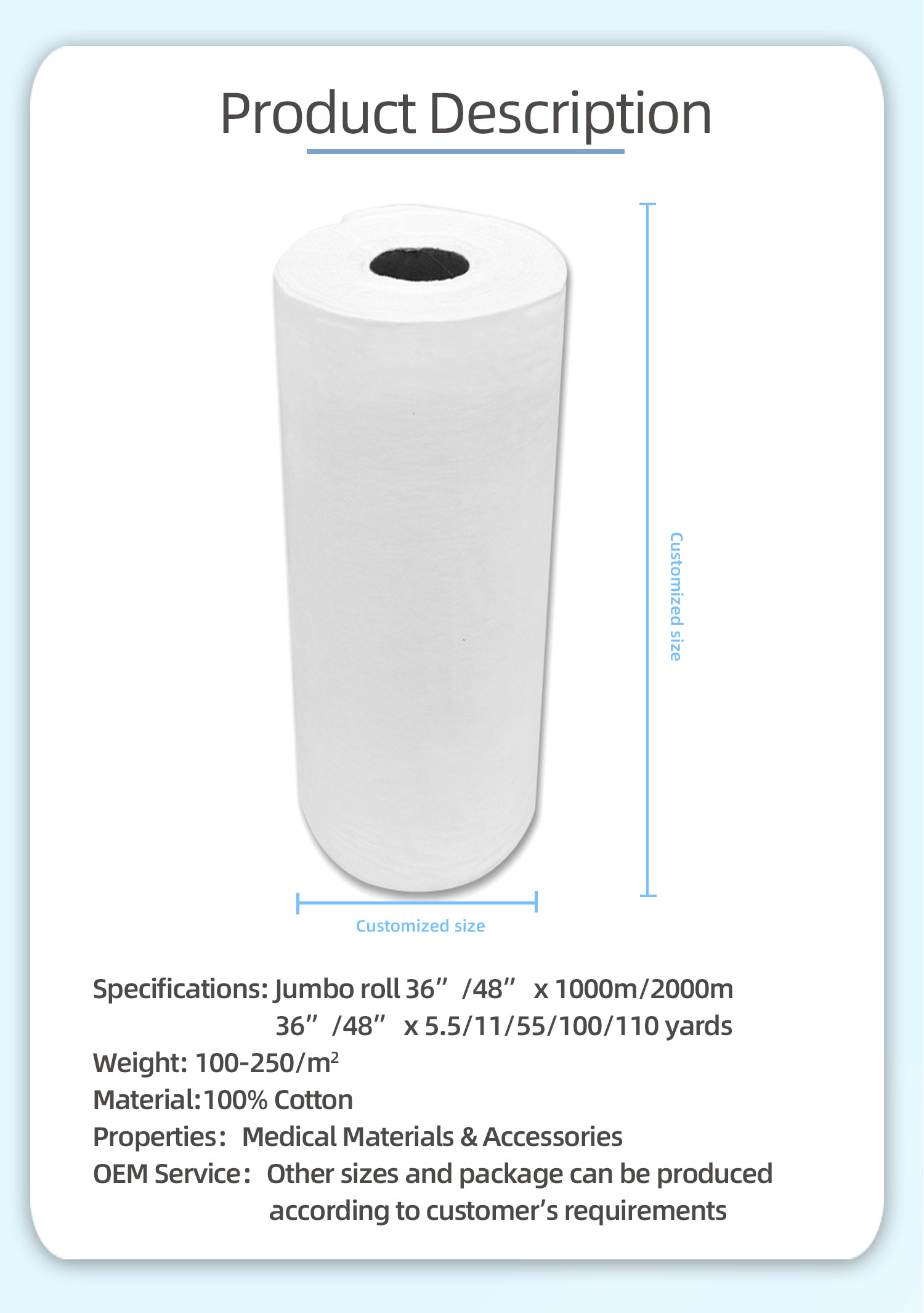 Description:The spunlace cotton roll is a type of nonwoven cotton product that is commonly used in medical and cosmetic settings. It is made by a process called spunlacing, which involves using high-pressure water jets to entangle and intertwine cotton fibers into a uniform sheet or roll.